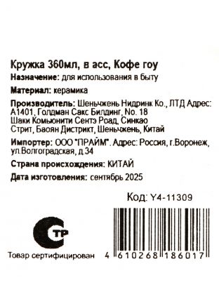 Кружка керамика, 360 мл, Кофе гоу, Y4-11309, в ассортименте