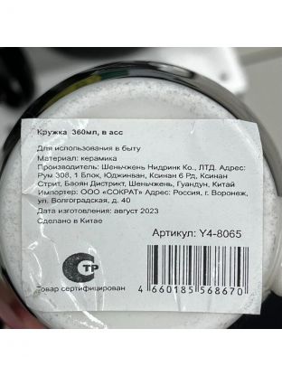 Керамическая кружка 360 мл Y4-8065: стиль для дома и офиса, подходит для СВЧ и посудомоечной машины. Отличный выбор на каждый день.