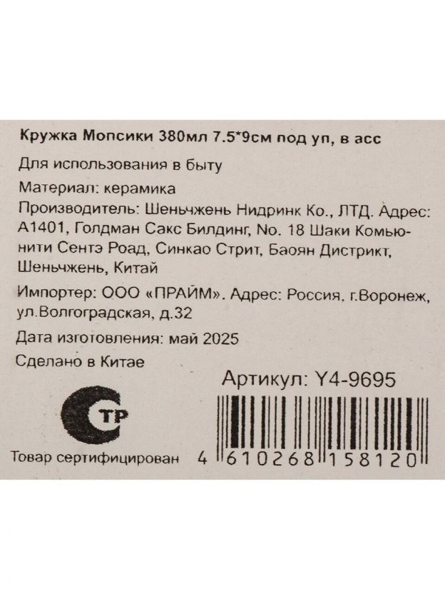 Кружка керамика, 380 мл, Мопсики, 7.5х9 см, подарочная упаковка, Y4-9695, в ассортименте