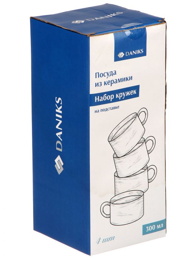 Объём каждой кружки — 300 мл, высота — 78 мм, диаметр — 82 мм, материал — керамика; подставка металлическая, общий вес набора — 715 г.