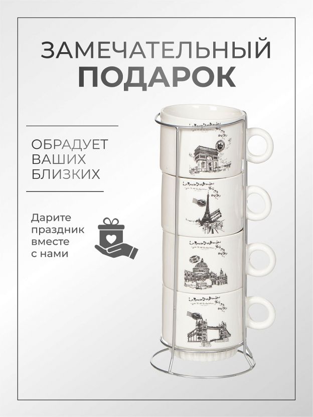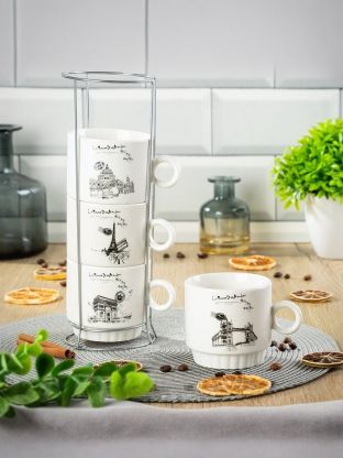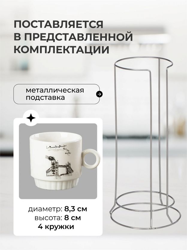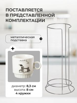 Вы получаете сразу четыре кружки объёмом 300 мл, которые удобно хранить на металлической подставке — экономия места и всегда порядок на кухне или в офисе.