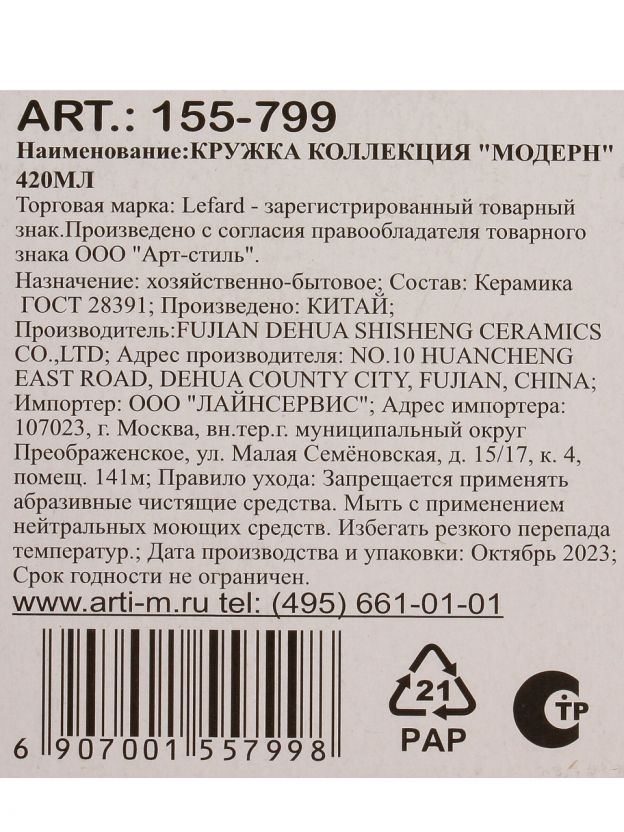 Можно ли мыть такую кружку в посудомоечной машине? Производитель рекомендует ручную мойку — это продлевает срок службы и сохраняет внешний вид. Кружка не комплектуется крышкой, ситечком или двойными стенками, что делает её лёгкой и удобной для ежедневного использования. Часто спрашивают, подойдёт ли Lefard Модерн для подарка — да, благодаря универсальному дизайну и брендовой упаковке, она станет отличным презентом на любой случай.