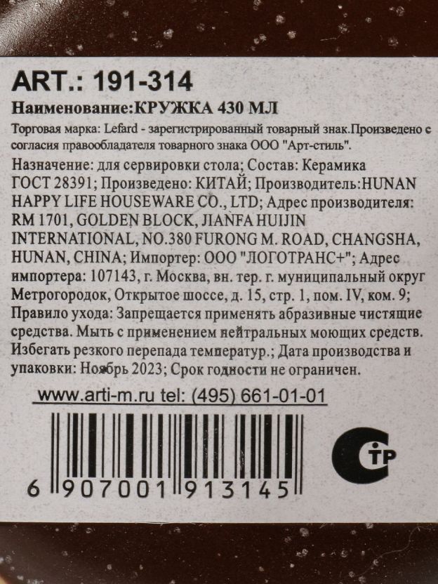 • Объем 430 мл, прочная керамика без эмалевого покрытия — удобно для больших порций кофе или чая.