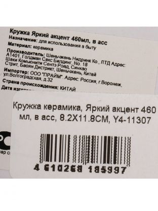 Высота 11,8 см, диаметр 8,2 см, объем 460 мл. Кружка выполнена из керамики, представлена в разных цветах (без подбора оттенка).