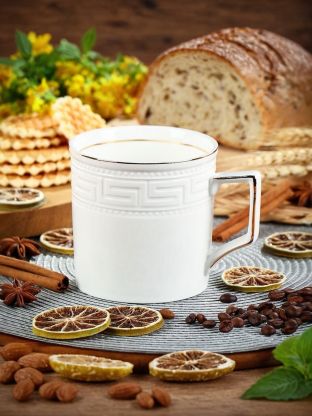 Кружка изготовлена из прочной керамики, объем — 500 мл, вес — 410 г. Цвет — белый с греческим узором. Без крышки, ситечка и ложки в комплекте.