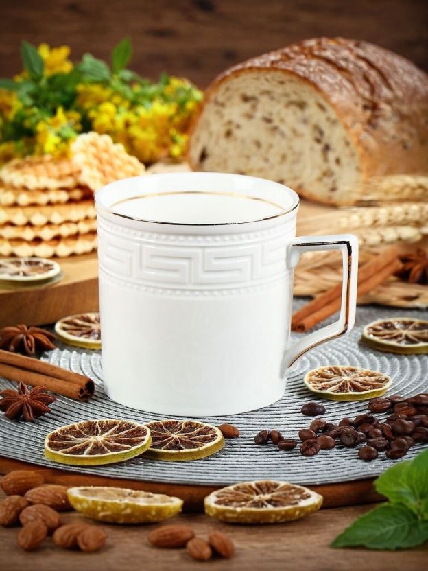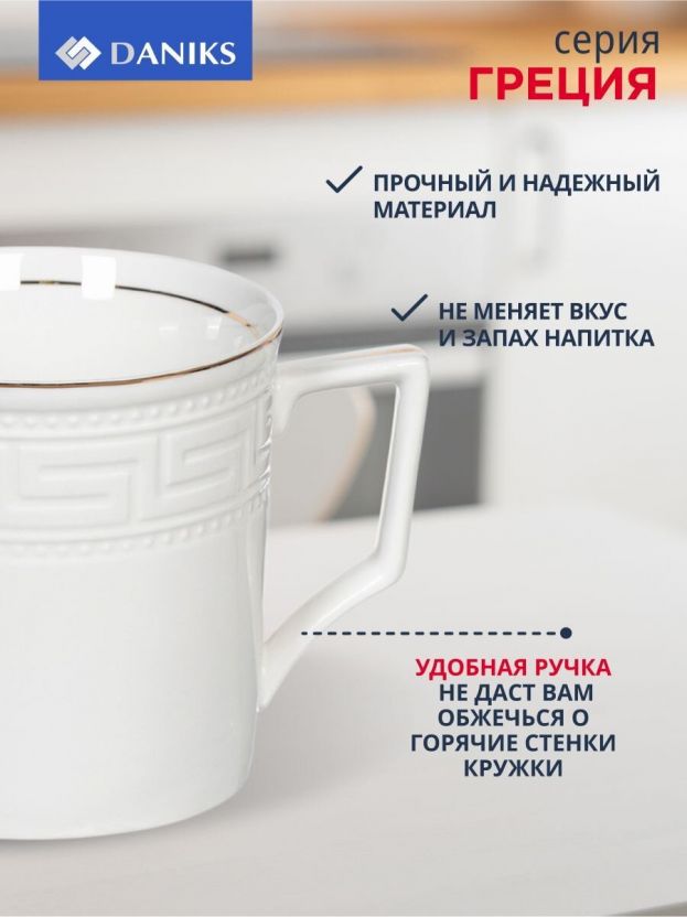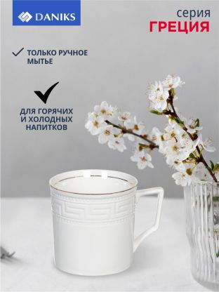 Если вы ищете, какую кружку купить недорого для дачи или для уютных вечеров дома, обратите внимание на Daniks «Греция». Она не подходит для посудомоечной машины, зато легко моется вручную. Белый цвет и стильный узор впишутся в современный интерьер, а вес 410 г делает её устойчивой на столе.