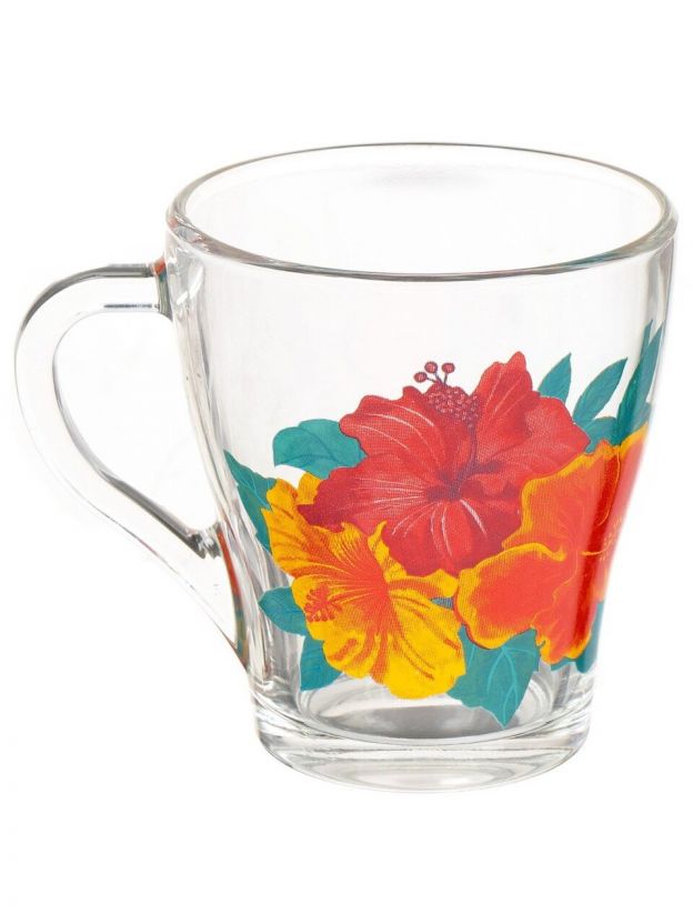 Стеклянная кружка ОСЗ «Грация Гибискусы», 250 мл — идеальный выбор для стильных напитков дома и на даче: прочное стекло, цветочный дизайн, подходит для СВЧ и посудомоечной машины.