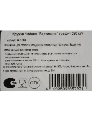 Кружка стекло, 320 мл, Чайная Вертикаль, ОСЗ, 24с2394, графит
