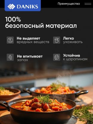 Эргономичные формы делают посуду удобной и практичной в процессе эксплуатации. Качественные материалы и современные технологии способствуют долгому сроку службы изделия. А соответствие всем экологическим нормам характеризует изделия торговой марки «Daniks» безопасными для потребителя.