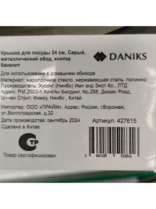 Крышка для посуды стекло, 24 см, Daniks, Серый, металлический обод, кнопка бакелит, Д4124С
