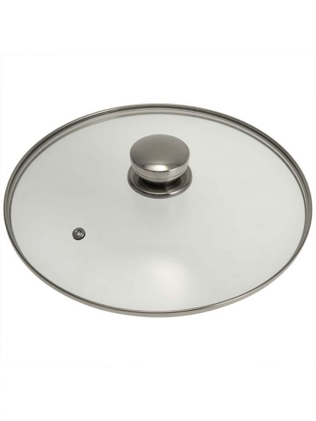 Крышка выполнена из закалённого стекла, имеет металлический обод и кнопку из нержавеющей стали. Диаметр — 24 см, форма — круглая.