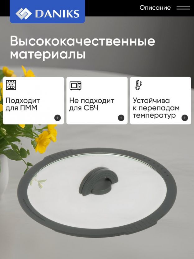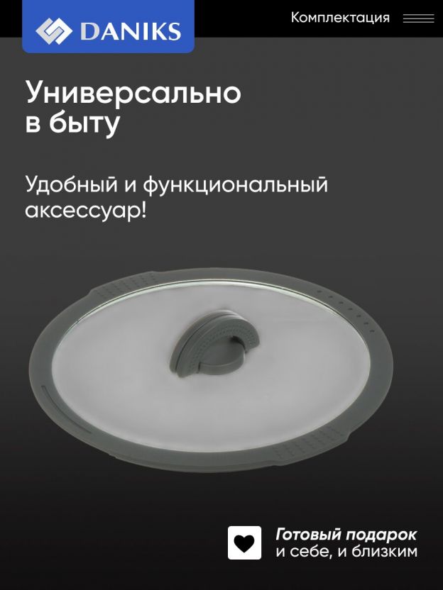 Как выбрать крышку для посуды? Обратите внимание на материал и диаметр: стекло позволяет контролировать процесс готовки, а 26 см — универсальный размер для большинства сковород и кастрюль. В отличие от аналогов с металлическим ободом, силикон не царапает поверхность и не ржавеет. Покупая крышку Daniks, вы получаете долговечный аксессуар, который легко мыть в посудомоечной машине и удобно хранить благодаря складной ручке.