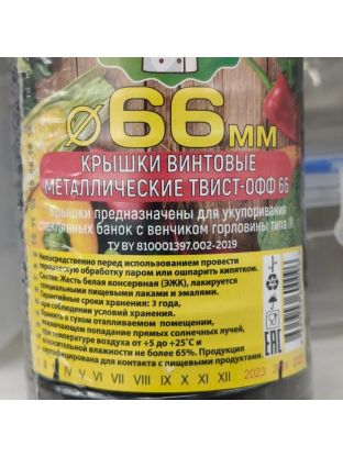 Крышка для консервирования твист-офф представляет собой штампованное металлическое укупорочное средство с упорами для завинчивания. Изготовлена из надёжной белой жести, покрыта безопасными пищевыми лаками.