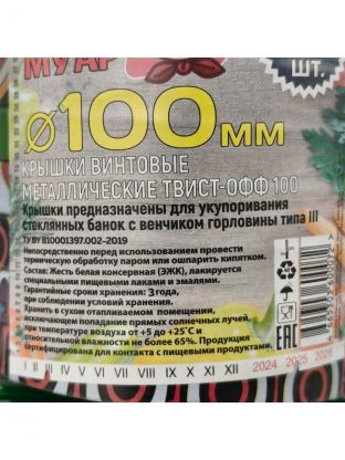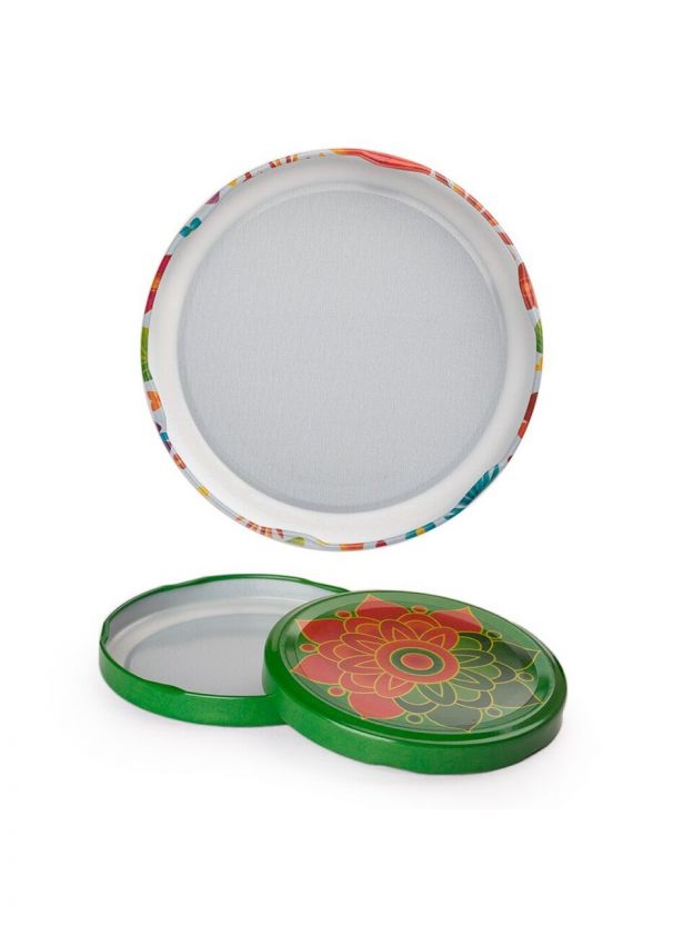 Крышка для консервирования твист-офф представляет собой штампованное металлическое укупорочное средство с упорами для завинчивания. Изготовлена из надёжной белой жести, покрыта безопасными пищевыми лаками.