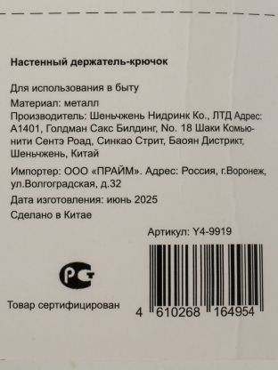 Крючок-держатель Y4-9919 с матовым покрытием: стильное решение для порядка в доме и на даче. Прочный металл, современный дизайн.