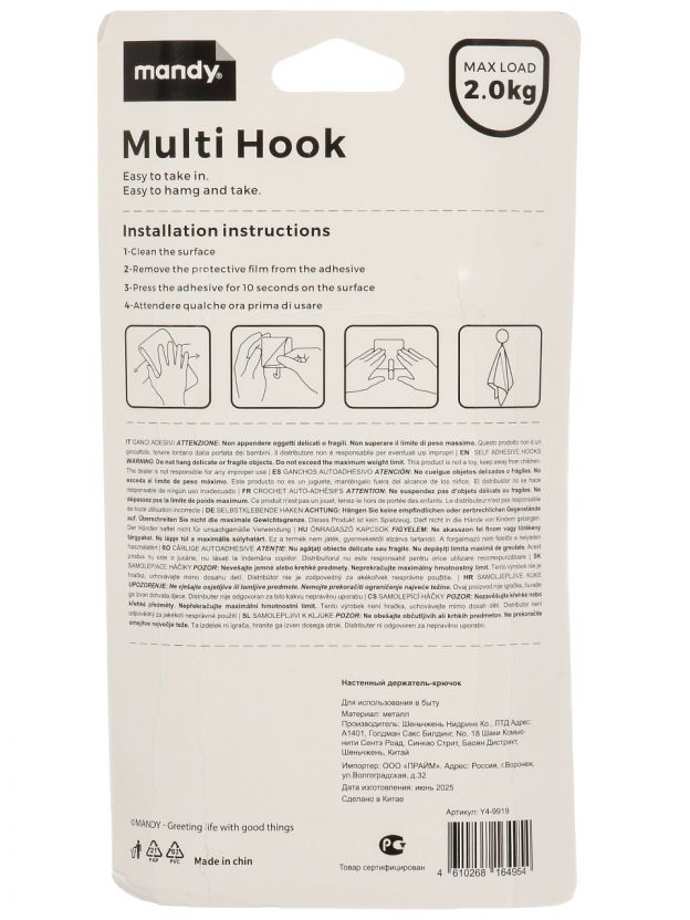 В модели Y4-9919 предусмотрено два металлических крючка с матовым покрытием — оптимально для хранения одежды и аксессуаров.