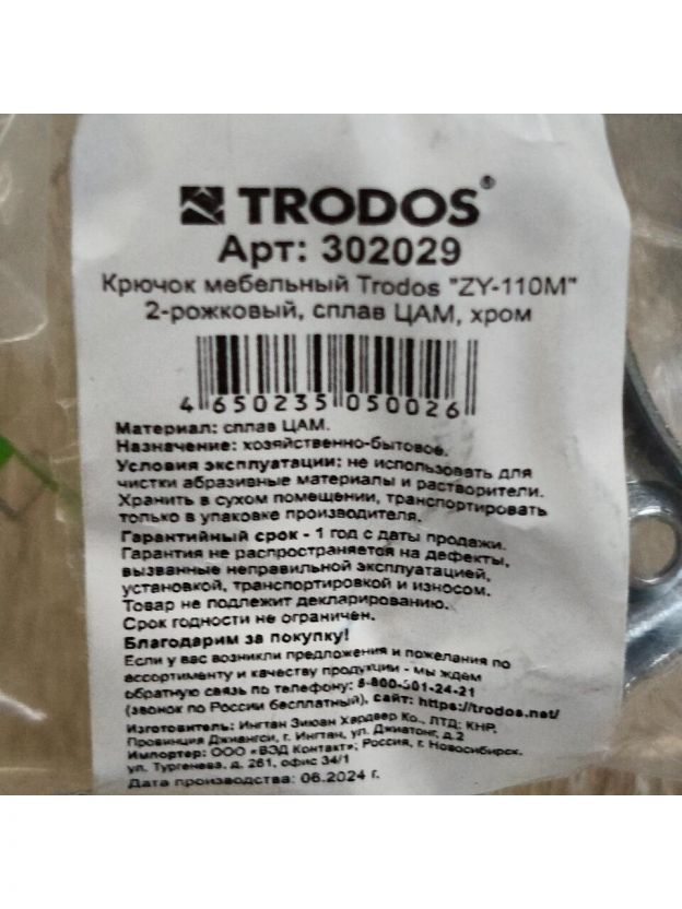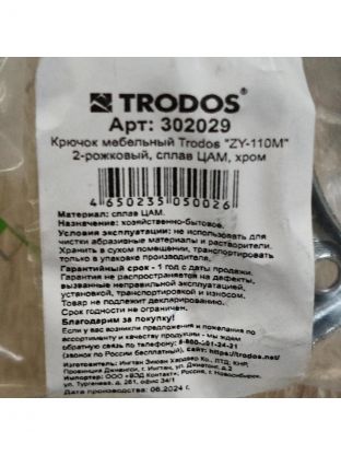 Крючок 2-рожковый малый, Trodos, 04.11.02 Двойной, 302029, хром