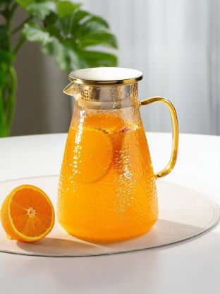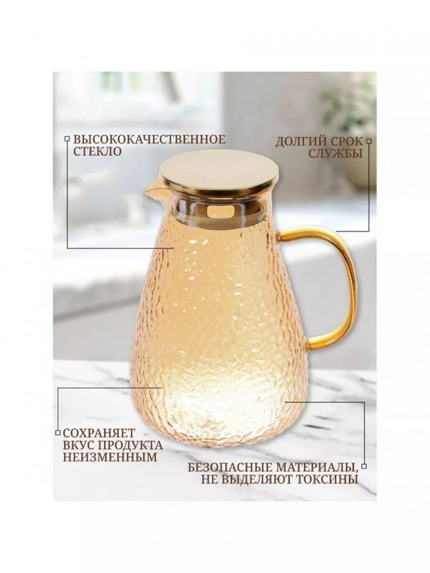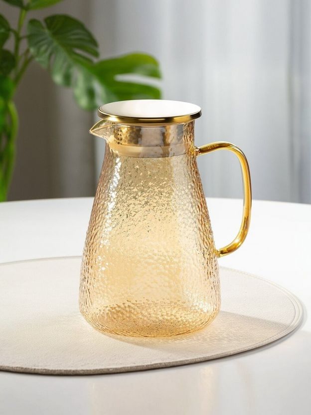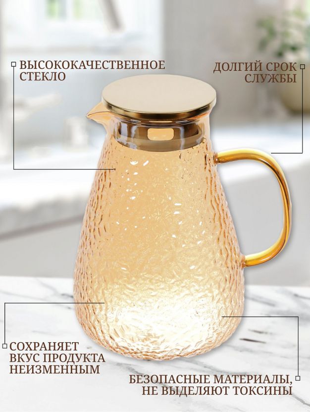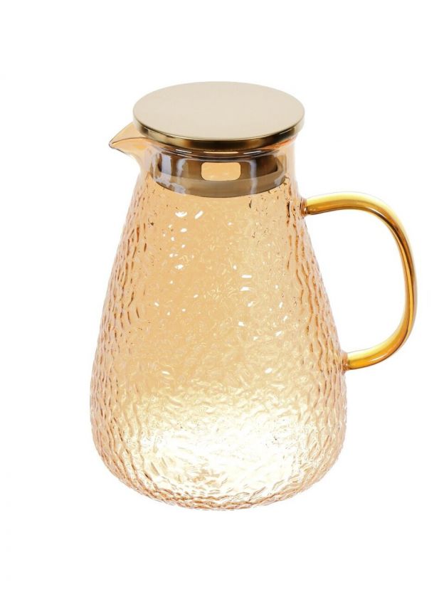 Стеклянный кувшин - полезный кухонный атрибут, который можно использовать в качестве ёмкости для Ваших любимых напитков. Данная модель кувшина изготовлена из стекла и выполнена в нежном золотисто-медовом цвете. Кувшин закрывается с помощью крышки, которая сохранит аромат и вкус Вашего напитка насыщенным. Станет прекрасным дополнением на Вашем повседневном, или праздничном столе, а также хорошим вариантом для подарка. Выполнен из термостойкого стекла и подходят для горячих напитков (чая/кофе).