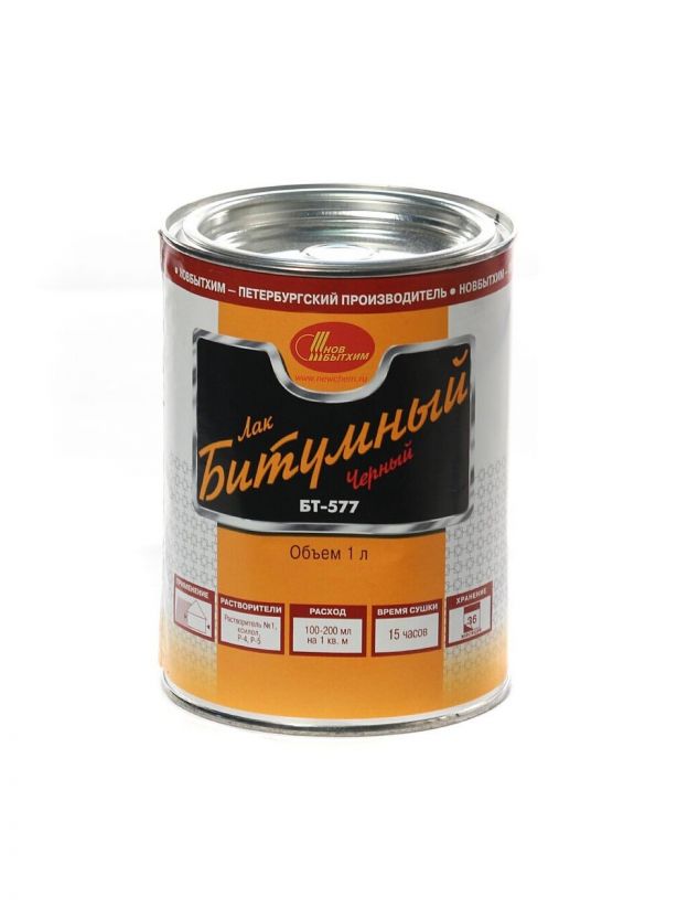 Лак НовБытХим, БТ-577, глянцевый, битумный, черный, для внутренних и наружных работ, 1 л