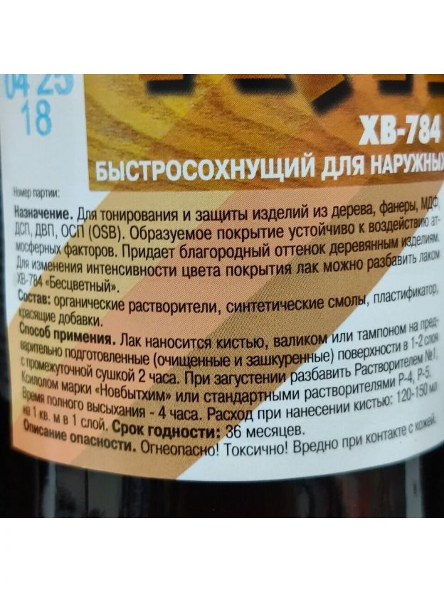 Лак ХВ-784 предназначен для тонирования и защиты деревянных изделий, эксплуатирующихся в атмосферных условиях и внутри помещений. Придаёт благородный оттенок деревянным изделиям.