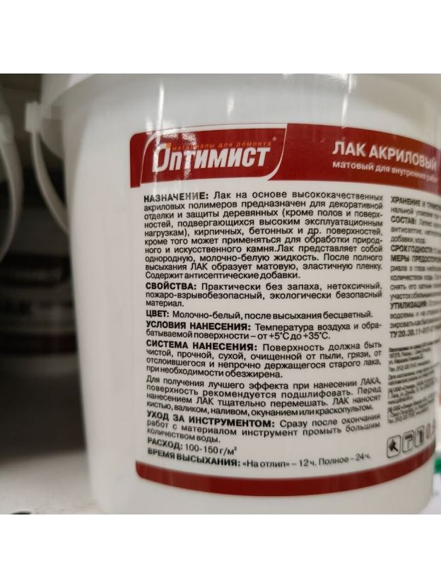 Акриловый лак Оптимист идеально подходит для внутренних работ. Он образует эластичное и долговечное покрытие.