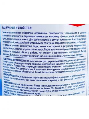 Наносить на чистую, сухую, шлифованную древесину. Зачистить до полного удаления лакокрасочного покрытия, потемнений, масляных и жировых пятен, удалить пыль, промыть. Поверхности, поврежденные грибками плесени и синевы, обработать специальными составами. Для дополнительной защиты от биокоррозии и выравнивания впитывающей способности основания обработать в 1 слой бесцветным составом Биотонер, зашкурить после высыхания.