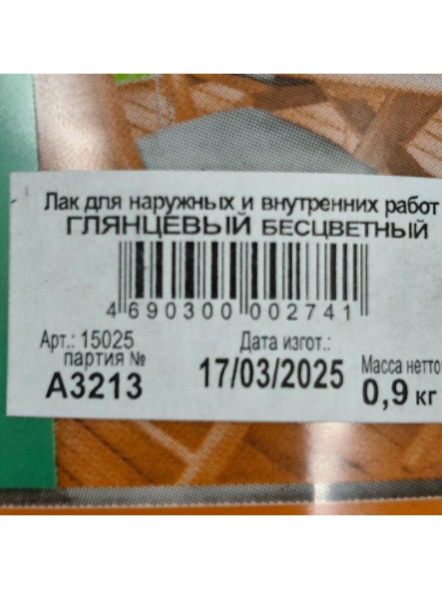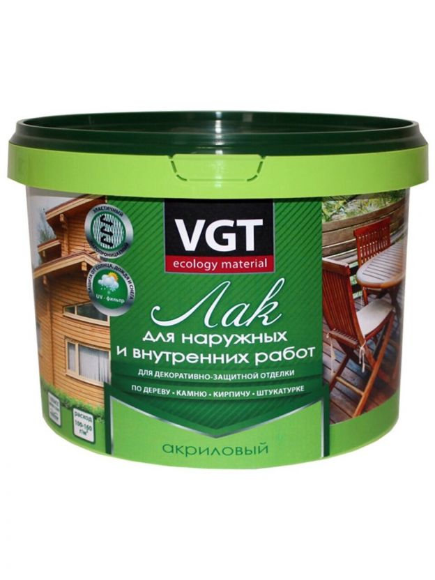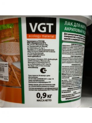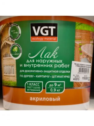 Лак VGT, глянцевый, акриловый, бесцветный, для внутренних и наружных работ, 0.9 кг