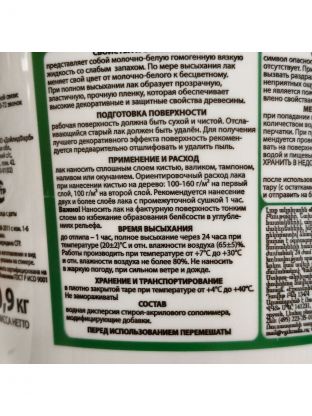 Расход: Ориентировочный расход при нанесении кистью на дерево 100-160 г/м2 первый слой, 100 г/м2 второй слой. Для получения лучшего декоративного эффекта рекомендуется двукратное или многократное нанесение с промежуточной сушкой 1 час.