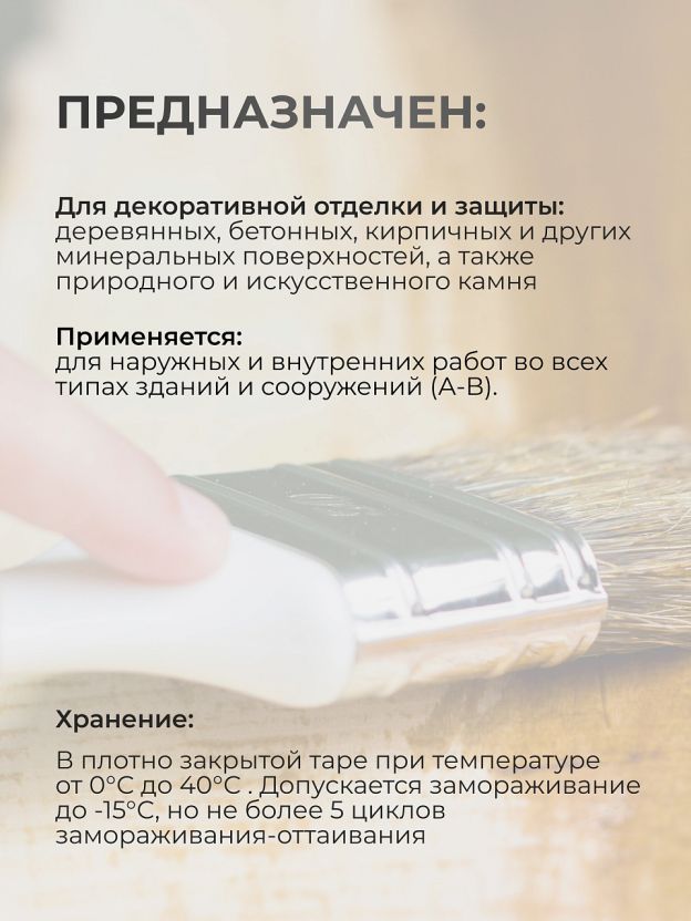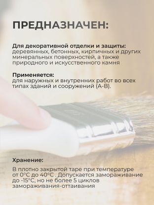 Предназначен для декоративной отделки и защиты деревянных (кроме полов), кирпичных, бетонных и других минеральных поверхностей, а также природного и искусственного камня. Может использоваться в качестве промежуточного слоя, в том числе для полов.