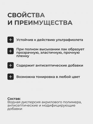Свойства и особенности: Представляет собой молочно-белую гомогенную вязкую жидкость со слабым запахом. По мере высыхания лак меняет свой цвет от молочно- белого к бесцветному. При полном высыхании лак образует прозрачную, эластичную, прочную пленку.