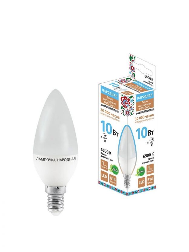 Лампа светодиодная E14, 10 Вт, 75 Вт, свеча, 6500 К, холодный белый свет, TDM Electric, Народная, SQ0340-1596