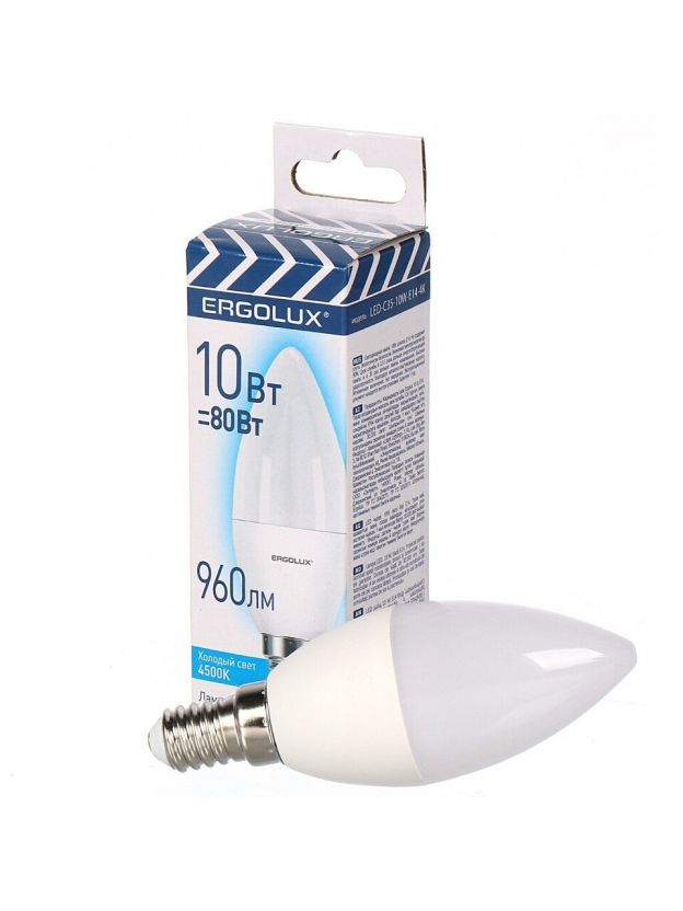 Лампа светодиодная E14, 10 Вт, 80 Вт, свеча, 4500 К, нейтральный белый свет, Ergolux