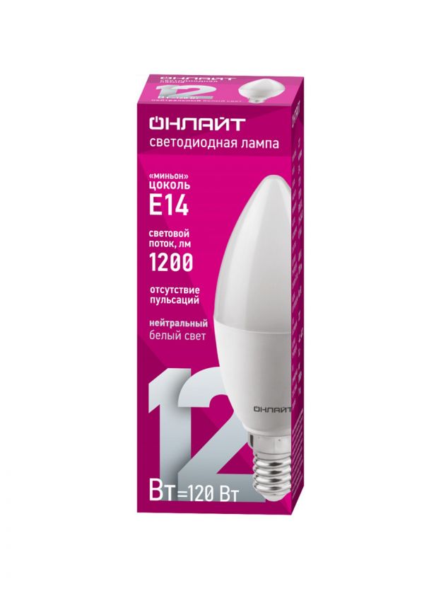 Лампа светодиодная E14, 12 Вт, 120 Вт, свеча, 4000 К, нейтральный белый свет, Онлайт, 90055