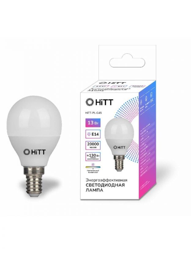 Лампа светодиодная E14, 13 Вт, 230 В, груша, 4000 К, нейтральный белый свет, HiTT, HiTT-PL-G45, G45, 1010059