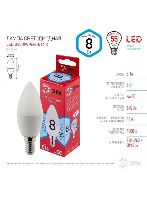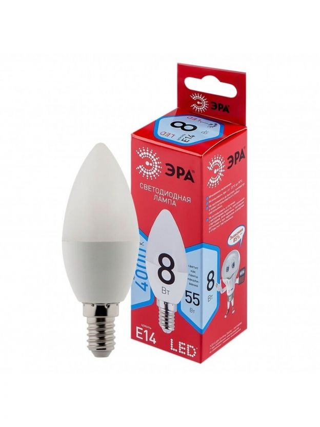 Лампа светодиодная E14, 8 Вт, 55 Вт, свеча, 4000 К, нейтральный белый свет, Эра, Red Line