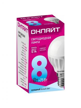Лампа светодиодная E14, 8 Вт, 75 Вт, шар, 4000 К, нейтральный белый свет, Онлайт, 71624