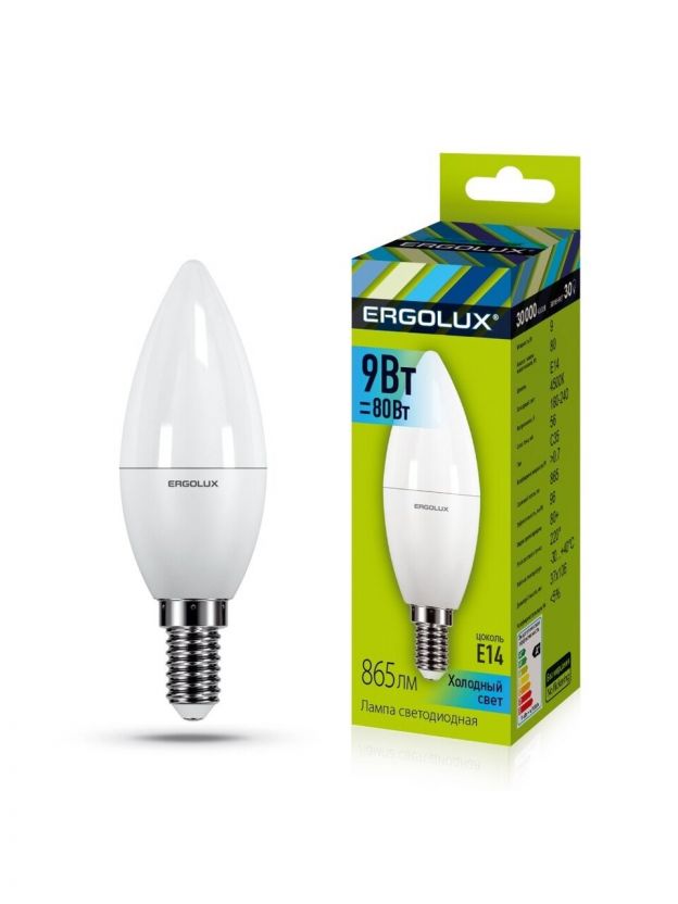 Лампа светодиодная E14, 9 Вт, 80 Вт, 220 В, свеча, 4500 К, нейтральный белый свет, Ergolux, 13168