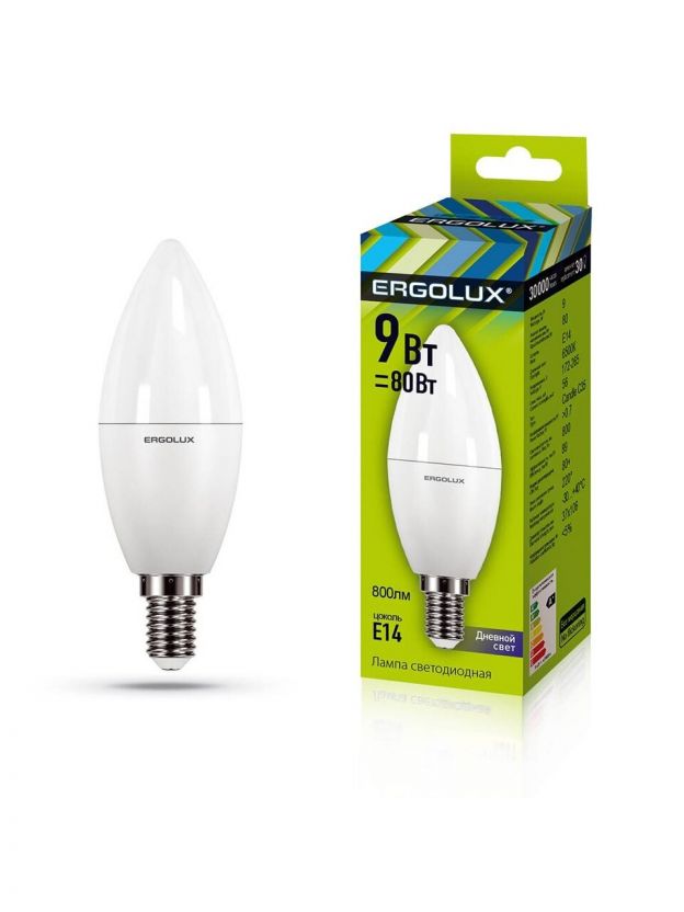 Лампа светодиодная E14, 9 Вт, 80 Вт, свеча, 6500 К, холодный белый свет, Ergolux, 13169