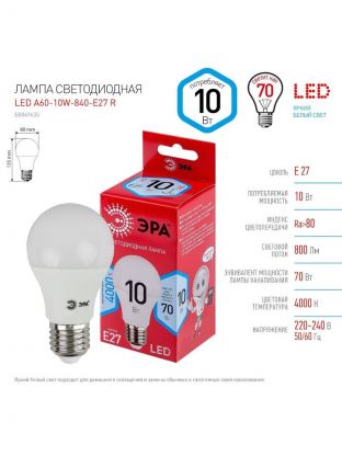 Лампа светодиодная E27, 10 Вт, 70 Вт, 220-240 В, груша, 4000 К, нейтральный белый свет, Эра, Б0049635