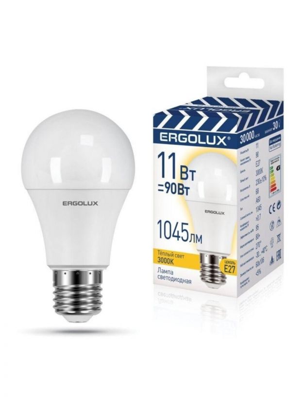 Лампа светодиодная E27, 11 Вт, 90 Вт, груша, 3000 К, теплый белый свет, Ergolux, 14458