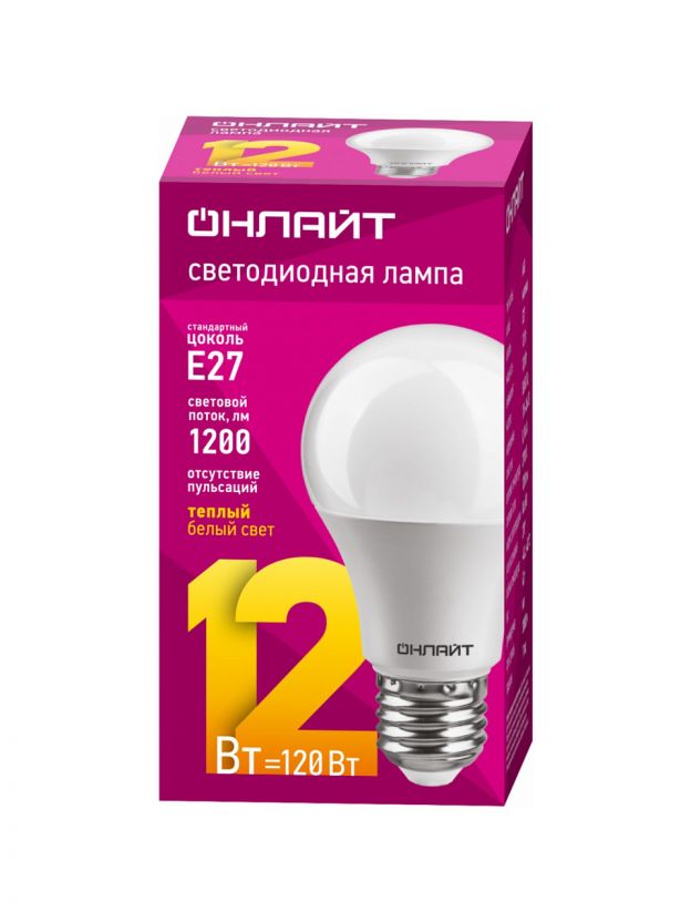 Лампа светодиодная E27, 12 Вт, 120 Вт, груша, 2700 К, теплый белый свет, Онлайт, 71682