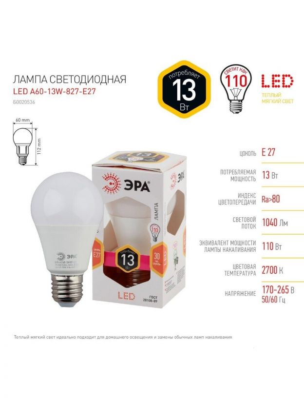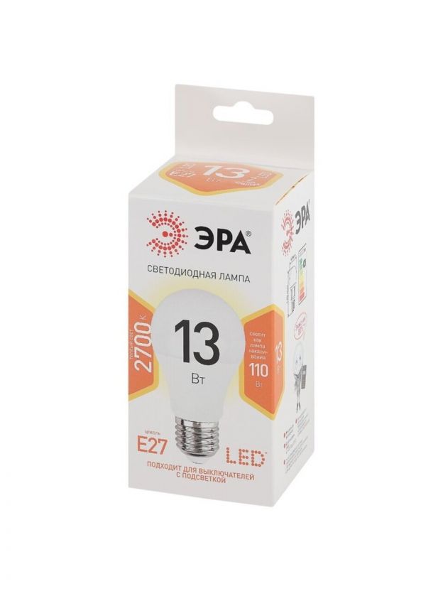 Лампа светодиодная E27, 13 Вт, 110 Вт, груша, 2700 К, теплый белый свет, Эра, Б0020536