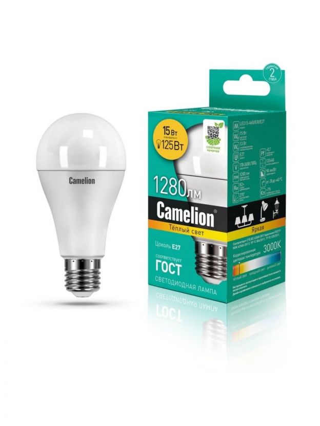 Лампа светодиодная E27, 15 Вт, 125 Вт, 220 В, груша, 3000 К, теплый белый свет, Camelion, 12185