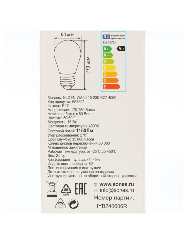 • Компактная груша A60 (60х113 мм), световой поток 1150 лм, срок службы 35 000 ч, гарантия 24 месяца;