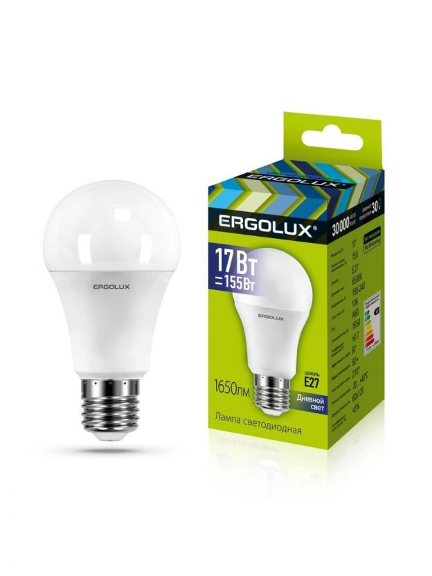 Лампа светодиодная E27, 17 Вт, 155 Вт, 220 В, груша, 6500 К, холодный белый свет, Ergolux, 13181