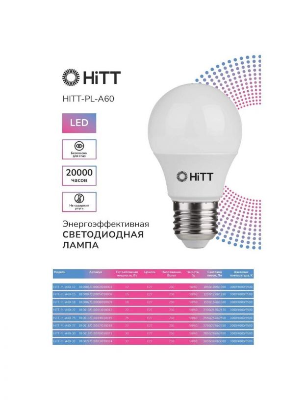 Лампа светодиодная E27, 22 Вт, 220 Вт, 230 В, груша, 6500 К, холодный белый свет, HiTT, HiTT-PL-A60, A60, 1010012