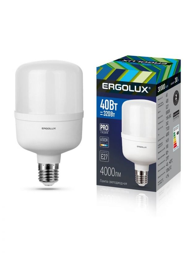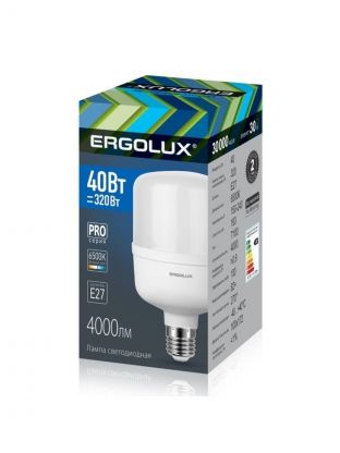 Лампа светодиодная E27, 40 Вт, 320 Вт, 150-240 В, цилиндрическая, 6500 К, холодный белый свет, Ergolux, LED-HW-40 PRO