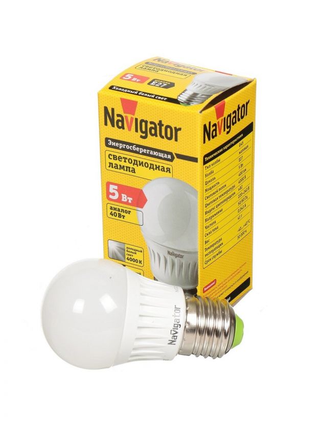 Лампа светодиодная E27, 5 Вт, 40 Вт, шар, 4000 К, холодный белый свет, Navigator, 94479