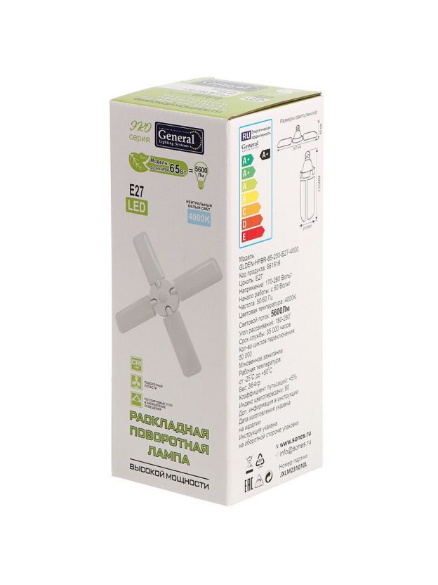 Обратите внимание на мощность (65 Вт), световой поток (5600 лм) и тип цоколя (E27). Эта лампа подходит для больших и высоких помещений благодаря раскладной конструкции и холодному белому свету.