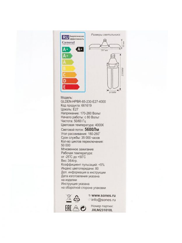 Размер: 91х235 мм, цоколь E27, мощность 65 Вт, световой поток 5600 лм, цветовая температура 4000 К, индекс цветопередачи CRI 80, гарантия 12 месяцев.